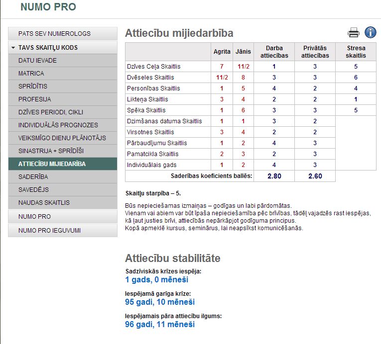 Lietotājs var iepazīties atsevišķi ar konkrētu numeroloģisku rādītāju saderību ballēs darba un privātās attiecībās, tādējādi redzot attiecību vājākos un stiprākos balstus.